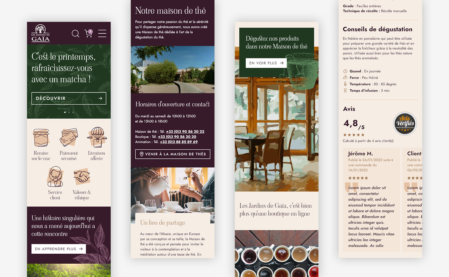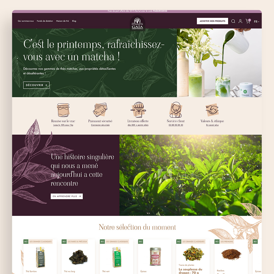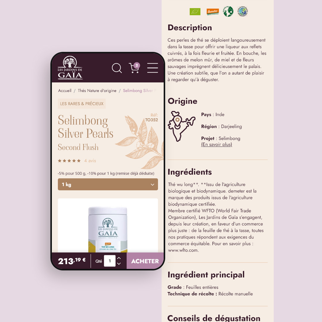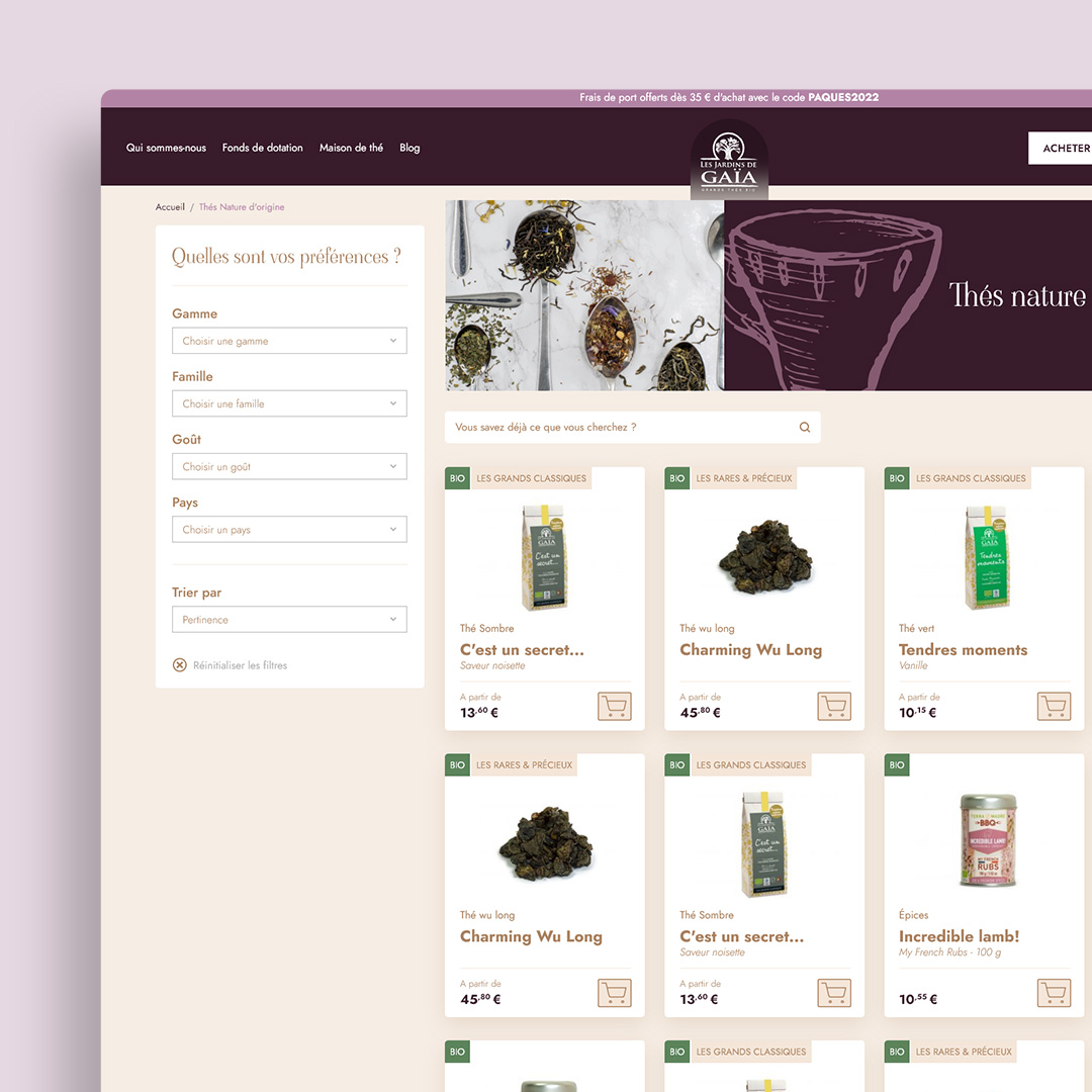 C’est un e-shop de thé mais également un site vitrine pour le lieu de vente qui est un salon de thé unique en son genre. Le défi était donc de faire cohabiter l’e-shop de manière discrète avec le site vitrine, tout en gardant une expérience client optimale.